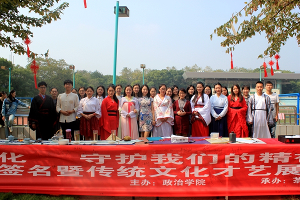 文化兴国运兴,文化强民族强。10月22日,在党的十九大胜利召开的喜庆氛围里,政治学院以“亲近中华优秀传统文化,守护我们的精神家园”为主题,在校园北区大学生活动中心室外举办了弘扬优秀传统文化签名暨传统文化才艺展示活动。此次活动由政治学院硕士生导师赵美岚老师创意策划,政治学院全体研究生组织参与,并在PG电子麻将胡了2技巧-麻将胡了2规则大学生茶艺社、墨韵书法协会倾情协助下顺利开展。