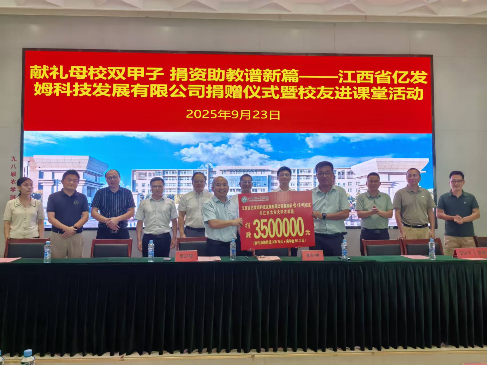 9月23日,农学院举行“献礼母校双甲子,捐资助教谱新篇”校友捐赠仪式暨校友企业家进课堂活动。我校1987级植物保护专业校友、江西省亿发姆科技发展有限公司董事长李任明,副校长张高亮,原副校长、作物生理生态与遗传育种教育部重点实验室主任贺浩华,我校人事处、校友工作服务中心、农学院负责人及农学院师生代表180余人参加了此次活动。校友李任明代表企业向我校捐赠了价值300万元的智慧农业教研系统和50万元的奖教金。