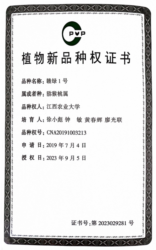 日前,我校农学院徐小彪教授团队在猕猴桃新品种选育与抗坏血酸调控机制研究方面取得新进展。团队选育的毛花猕猴桃‘赣绿1号’(品权号CNA20191003213)和中华猕猴桃‘赣金2号’(品权号:CNA20201000528)获国家植物新品种权证书。‘赣绿1号’果实可溶性固形物含量(19.40%,最高达22.2%)显著性高于国内外已有报道的毛花猕猴桃品种;‘赣金2号’为单花结果为主的中熟四倍体品种,果肉金黄,肉质细嫩。