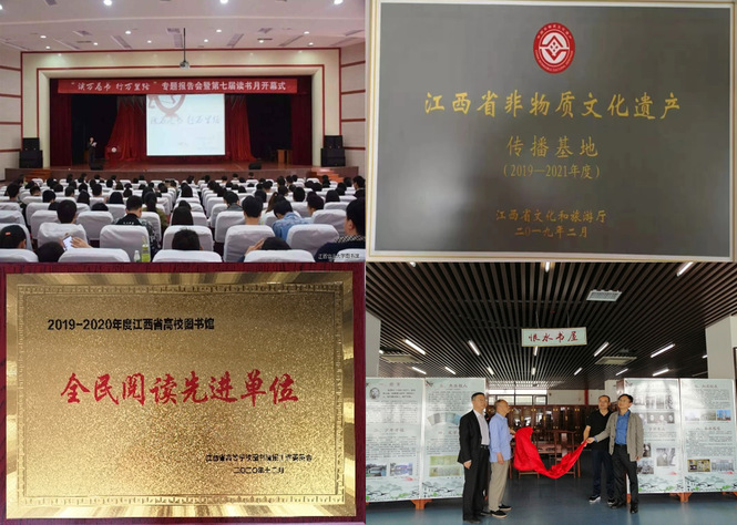 图书馆先后荣获江西省图书馆学会设立的“2018年全民阅读先进单位”“2022年全民阅读先进单位”荣誉称号,获江西省高校图工委设立的“2019-2020年度江西省高校图书馆全民阅读先进单位”荣誉称号,喜获江西省高校图工委 “2021年度江西省高校图书馆先进集体”荣誉称号。2019年2月,图书馆成功获批江西省非物质文化遗产传播基地。