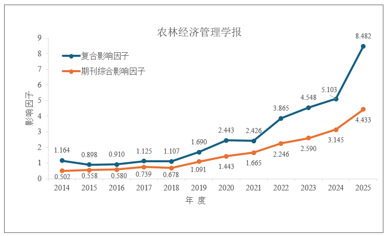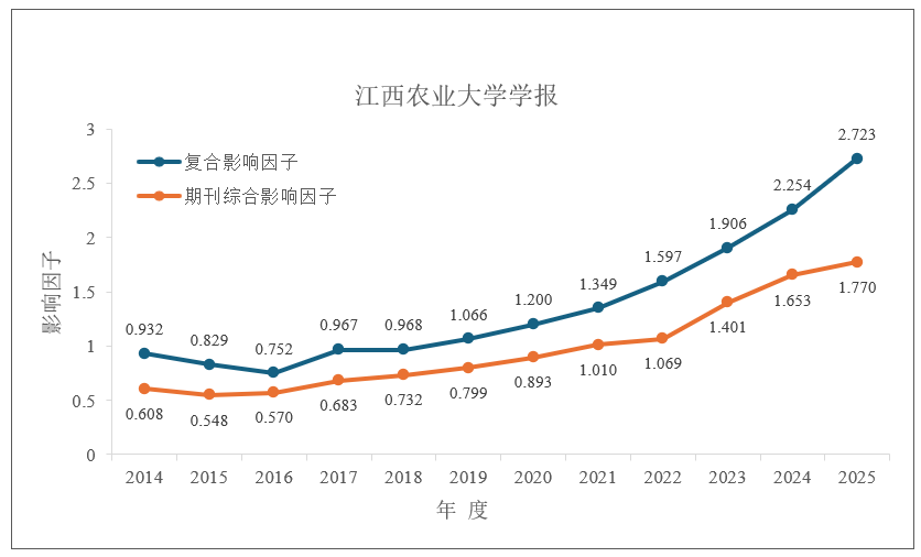 其中,《江西农业大学学报》2025年复合影响因子为2.723,较2024年提高20.81%,在全国117种农业综合类学术期刊中“影响因子学科排序”为第15位,位于Q1区;《农林经济管理学报》2025年复合影响因子为8.482,较2024年提高66.22%,在全国60种农业经济类学术期刊中“影响因子学科排序”为第9位,位于Q1区;《生物灾害PG电子》2025年复合影响因子为1.018,较2024年提高35.73%,影响因子首次突破1.0。这系列数据的提高,彰显出我校三刊在学术质量、行业认可度、传播力等方面持续进阶。