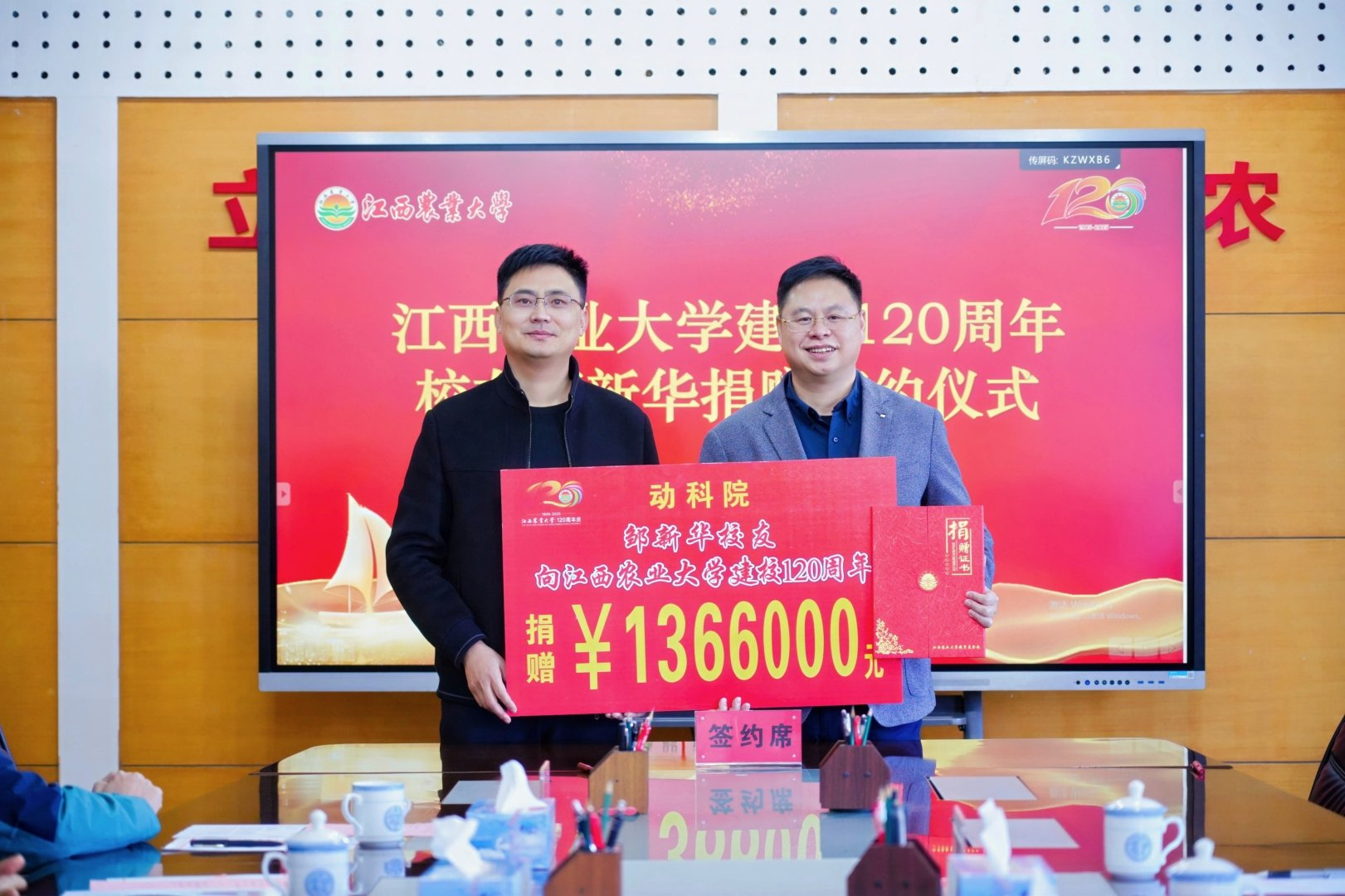 时值学校喜迎百廿华诞之际,11月19日,学校举行杰出校友、播恩集团董事长邹新华捐赠签约仪式。邹新华校友慷慨捐资136.6万元设立专项基金,支持母校人才培养与科研创新工作。副校长张高亮,原副校长曾志将教授,学校相关职能部门和动科院主要负责人参加捐赠仪式。